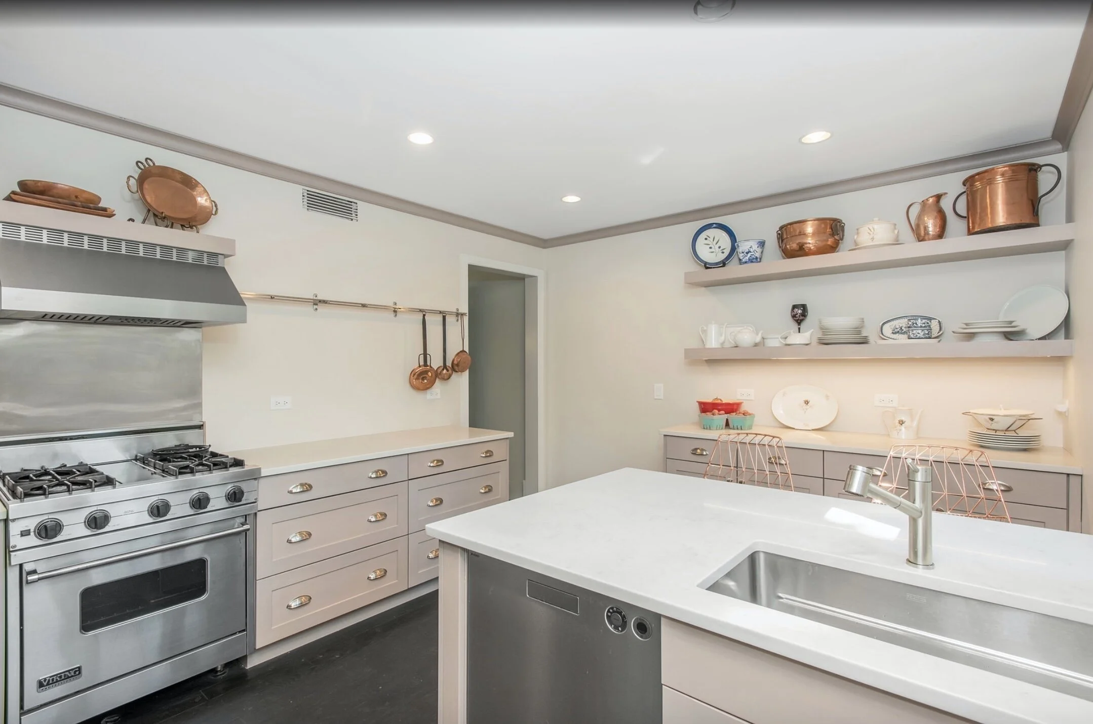 Colonial home in Hartsdale, NY needed a functional kitchen for holidays and entertaining. Keeping with the spirit of the home we used shaker style cabinets in a light finish to brighten the enclosed space. Moving the sink near the window and creating an island allows for guests to sit and visit while cooking. Using open shelves as display for a copper collection also made the room appear larger and more spacious.